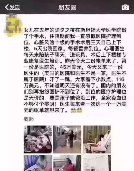 一位“裸險”女留學(xué)生在斯坦福大學(xué)醫(yī)院做了個有關(guān)心臟的手術(shù),術(shù)后5天就出院回家。在家人都在慶祝女孩康復(fù)的同時,收到了美國醫(yī)院和醫(yī)生的兩份賬單,一共170萬美元,換算成人民幣竟然是1100多萬元!!