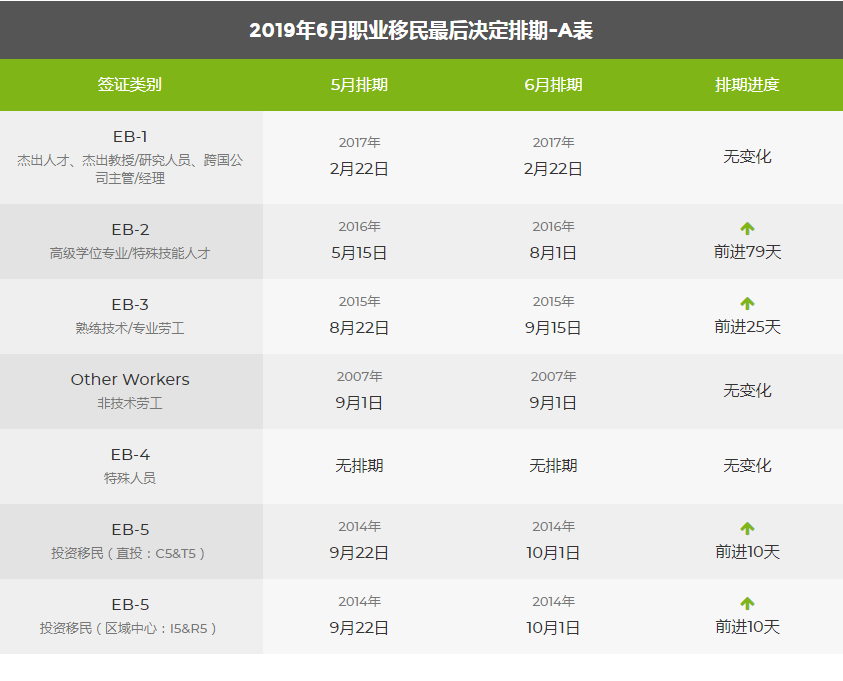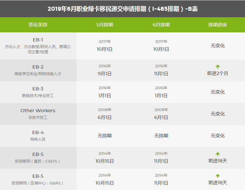 國務院公布的2019年6月綠卡移民排期公布,親屬移民前進幅度較大,職業移民 EB2 前進幅度較大有一個半月,EB3 穩步前進。以下是幾個重點: