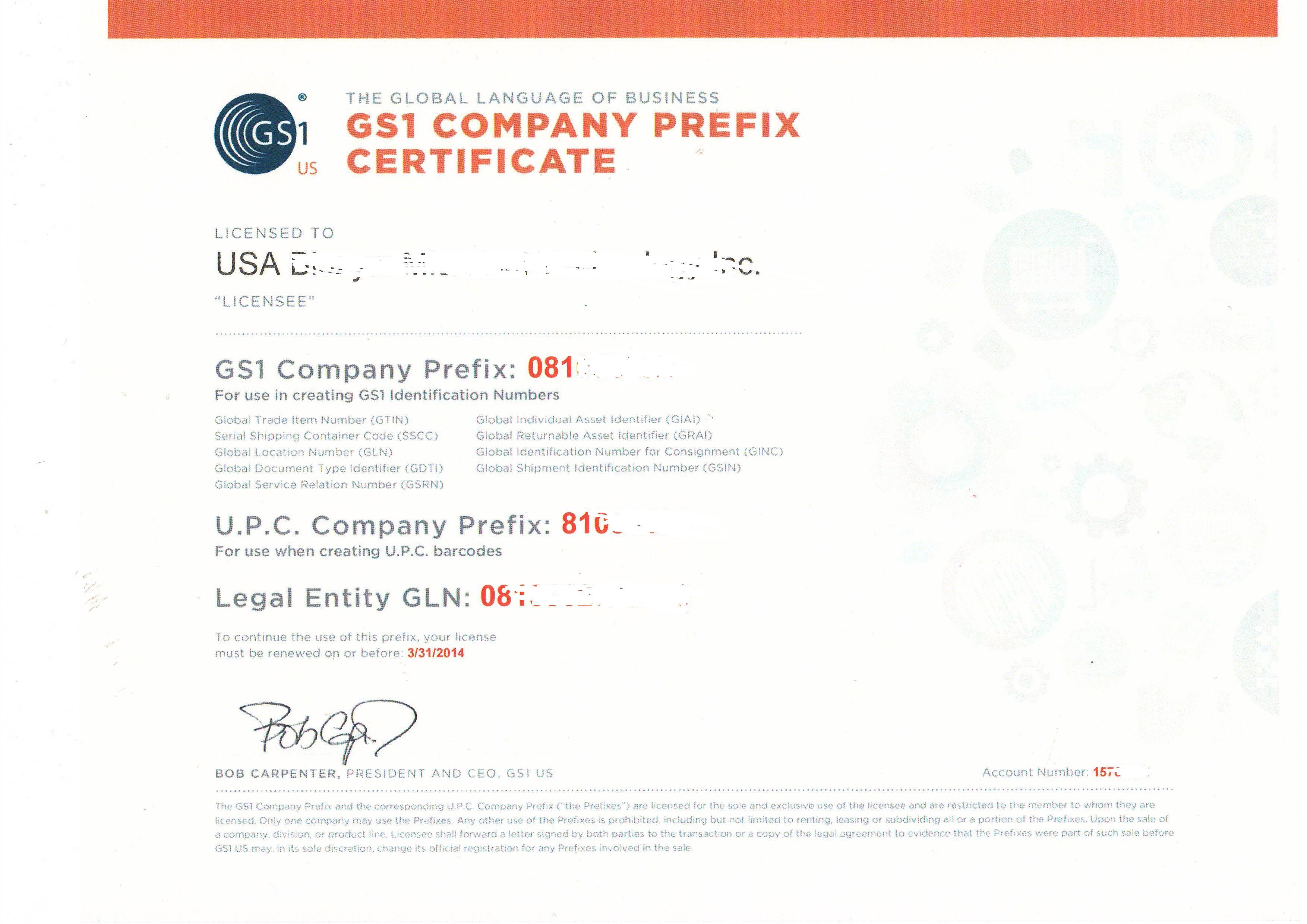 他做的行業是水產產品、農業產品、保健品等,需要將產品銷售美加地區,產品進入超市商場上國外貨架,同時也銷售到國內超市。根據鄭先生需求,美國認證協會北京代表處幫鄭先生在美國條碼申請中心GS1部門,申請了1000個條碼,并指導條碼后臺編輯和生成、印刷程序。條碼證書有更新,請參看成功文件。