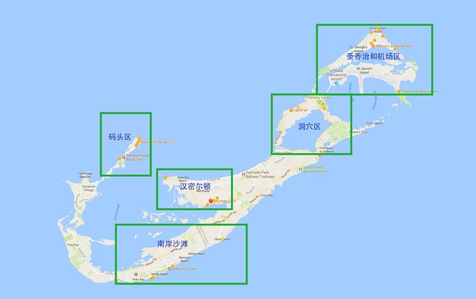 百慕大的景點大概可以分為這么幾個區域,從東到西分別為:圣喬治及機場區,洞穴區, 漢密爾頓 ,南岸沙灘,還有碼頭區。