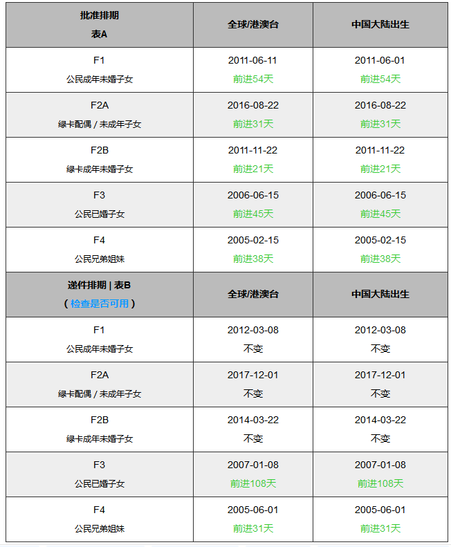 批準排期(Application Final Action Dates):指有簽證名額的排期,也稱表 A。